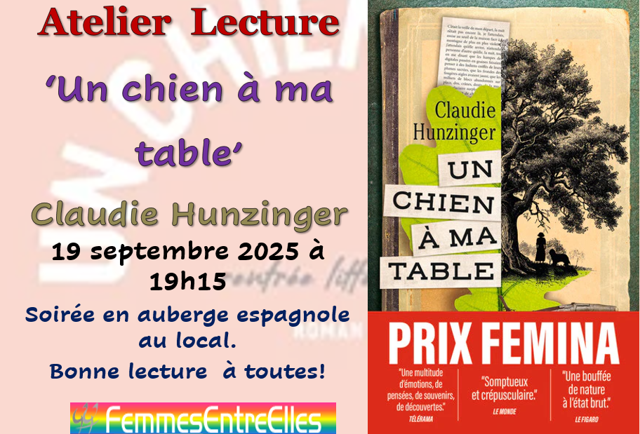 19 Septembre 2025, Atelier lecture à 19h15 au local. Pour la rentrée, Marijane nous propose l’ouvrage de Claudie Hunzinger, ‘Un chien à ma table’, livre paru en 2022 aux Editions Grasset qui a reçu le prix Fémina. ‘Un chien à ma table relie le féminin révolté et la nature saccagée : si notre époque inquiétante semble menacer notre avenir et celui des livres, les poètes des temps de détresse sauvent ce qu’il nous reste d’humanité’ source Grasset. L’atelier se tiendra en auberge espagnole. Un exemplaire est en circulation, contactez Aline. Roman qui embrasse la rencontre avec la nature et l’humain. A vos lectures !!!