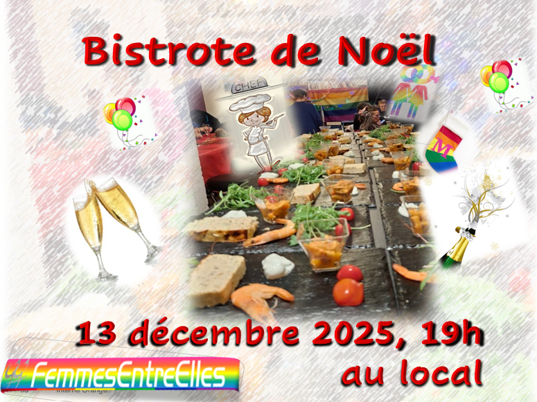 La bistrote de Noël c’est le 13 décembre 2025 à 19h au local. Le menu est en gestation, c’est le bureau des FEEs qui est aux fourneaux avec un repas FEEstif, comme à l’accoutumée. Pour le Noël des FEEs, apportez un cadeau d’une valeur 5-8 €, un tirage au sort sera fait pour la distribution des cadeaux !!! La soirée se poursuivra en pas de danse pour celles qui le souhaitent. Des bulles nous accompagneront en flocons de Noël.